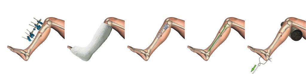 – Fijadores externos: tutores que van por fuera de la piel y fijan el hueso por medio de tornillos o agujas, de modo similar a un andamio. Por su poca invasividad, se utilizan cuando hay infección o probabilidad de infección (fracturas abiertas) o para la corrección de deformidades óseas.
